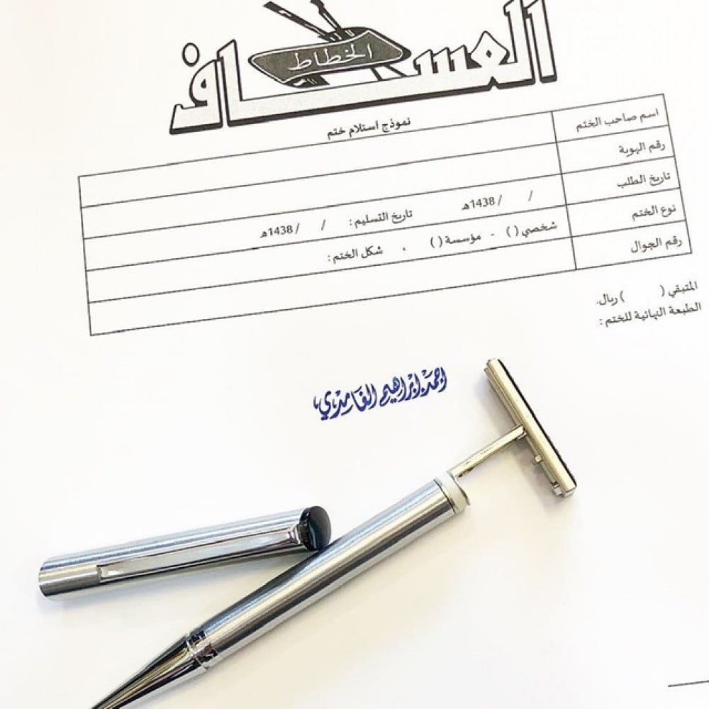 قلم ألماني + ختم ذاتي التحبير.مقاس الطبعة (موضّح في الصور).يستمر الحبر فترة 6 أشهر إلى سنة (تزيد أو تقل بزيادة وقلة الاستخدام).يمكن إعادة تعبئة الحبر بسهولة.سيتم إرسال التصميم على الواتس آب للاعتماد.مدة التنفيذ: 2 - 3 أيام عمل بعد اعتماد التصميم.في حال اختيار تصميم بخط يدوي تزيد مدة التنفيذ 2 - 4 أيام عمل.مدة التوصيل - الشحن: 1 - 3 أيام عمل.لمشاهدة نماذج من أعمالنا تفضل بزيارة حسابنا في إنستقرام: @alassaf1437