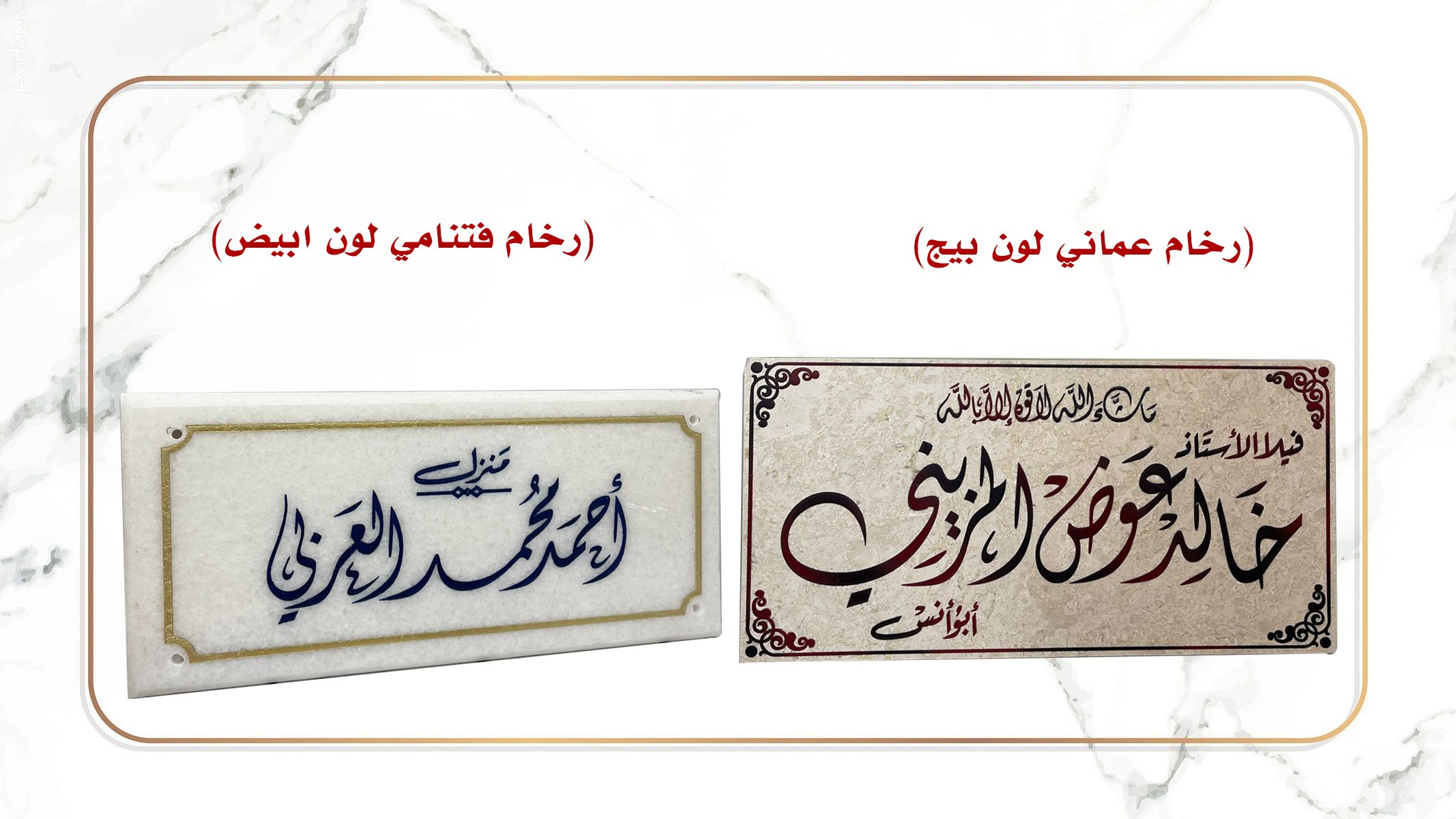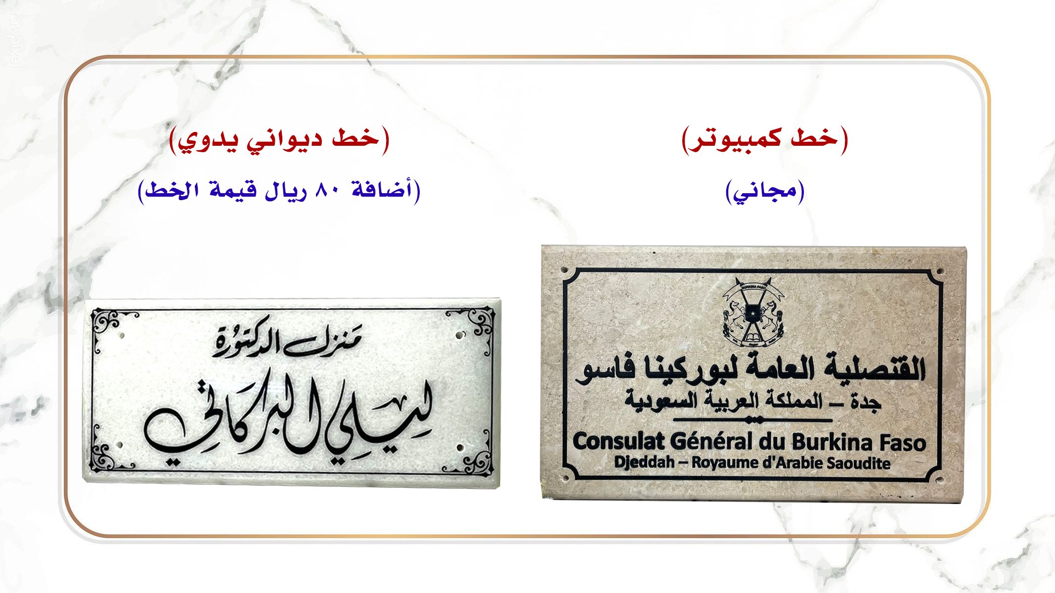 - الخط اليدوي: بالإمكان تنفيذ تصميم الرخام بالخط اليدوي (إضافة اختيارية)